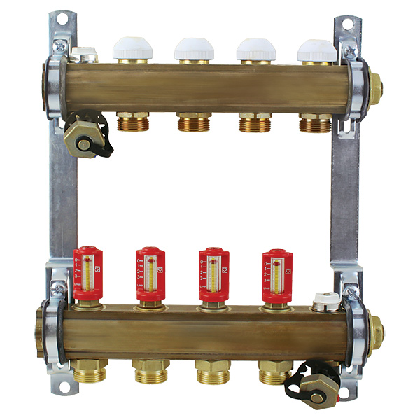 HERZ-fűtési rúdelosztó készlet Sárgaréz kivitel, 1"-os méret. Alkatrészek: előremenő elosztó termosztát felsőrészekkel és visszatérő elosztó átfolyásmérő szabályozó betétekkel, légtelenítés, leeresztés tömlőcsatlakozáson keresztül, zárósapkák és tartók, eltolt elosztókifolyók, G 3/4 csőcsatlakozás, Rp 1"-os méretű belső menetes osztó-gyűjtő.