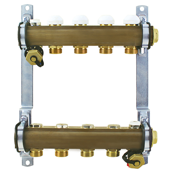 1-os méret. Alkatrészek: elosztó lezáró felsőrészekkel, gyűjtő termosztát felsőrészekkel, légtelenítés, leeresztés tömlőcsatlakozáson keresztül, zárósapkák és tartók, eltolt elosztókifolyók, G 3/4 csőcsatlakozás, 1-os méretű belső menetes elosztó.
