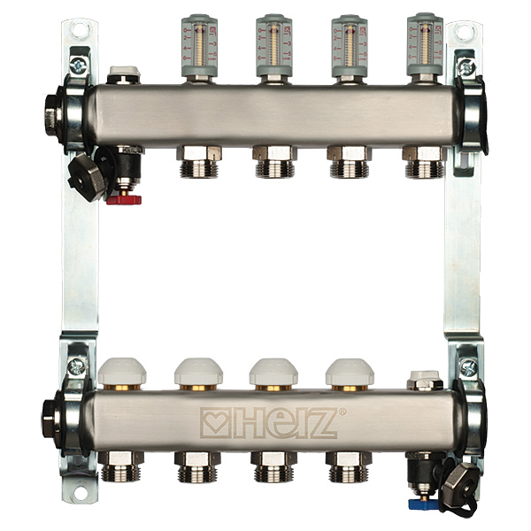 áramlásmérővel (6 l/min), méret 1”, a termosztatikus felsőrészekkel (M 28 x 1,5) ellátott visszatérő, áramlásmérővel ellátott előremenő. Légtelenítéssel és leeresztés tömlőcsatlakozással, elosztócsatlakozás belső Rp1 menettel, csőcsatlakozás G 3/4 eurokónuszos.