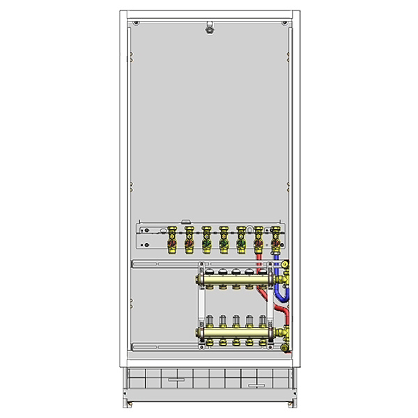 kerettel, fehér (RAL 9003), porszórt, szerelőkonzol, 3 körös osztó-gyűjtő áramlásmérővel és termosztatikus felsőrésszel.