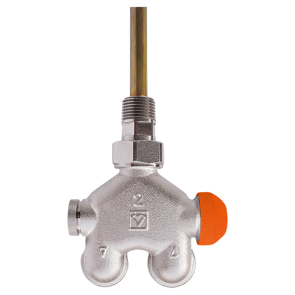 Fűtőtest-csatlakozás alulról, lapostömítésű, merülőcsővel l = 150 mm, Ø = 11 mm. Csatlakozó tengelytávolság: 40 mm. Működés közben szabályozható, a szelep-belsőrész nyomás alatt cserélhető. Csőcsatlakozás G 3/4-os külső menettel, eurokónuszos kialakítással. Csatlakozó csavarzat külön rendelendő!