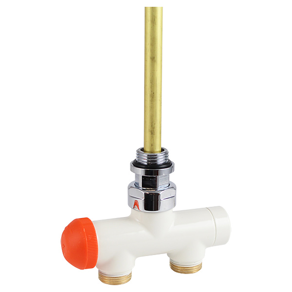 négyjáratú termosztatikus szelep kétcsöves üzemre, előbeallítható, merülőcsővel L = 290 mm, Ø 11 mm, by-pass nélkül, fehér kivitel, termosztatikus fej csatlakozása - M 28 x 1,5; csatlakozó tengelytávolság - 50 mm, csőcsatlakozás M 22 x 1,5.