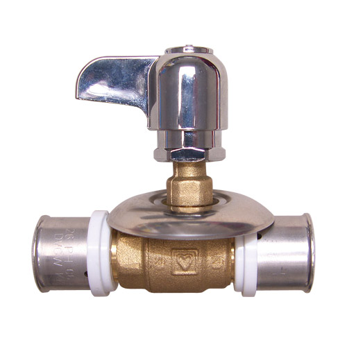 A golyóscsap kovácsolt rézből készült EN 12420 szerint. Presszcsatlakozás ötrétegű aluminium csőhoz, krómozott záróelemmel, teljes átömlő keresztmetszettel THU.